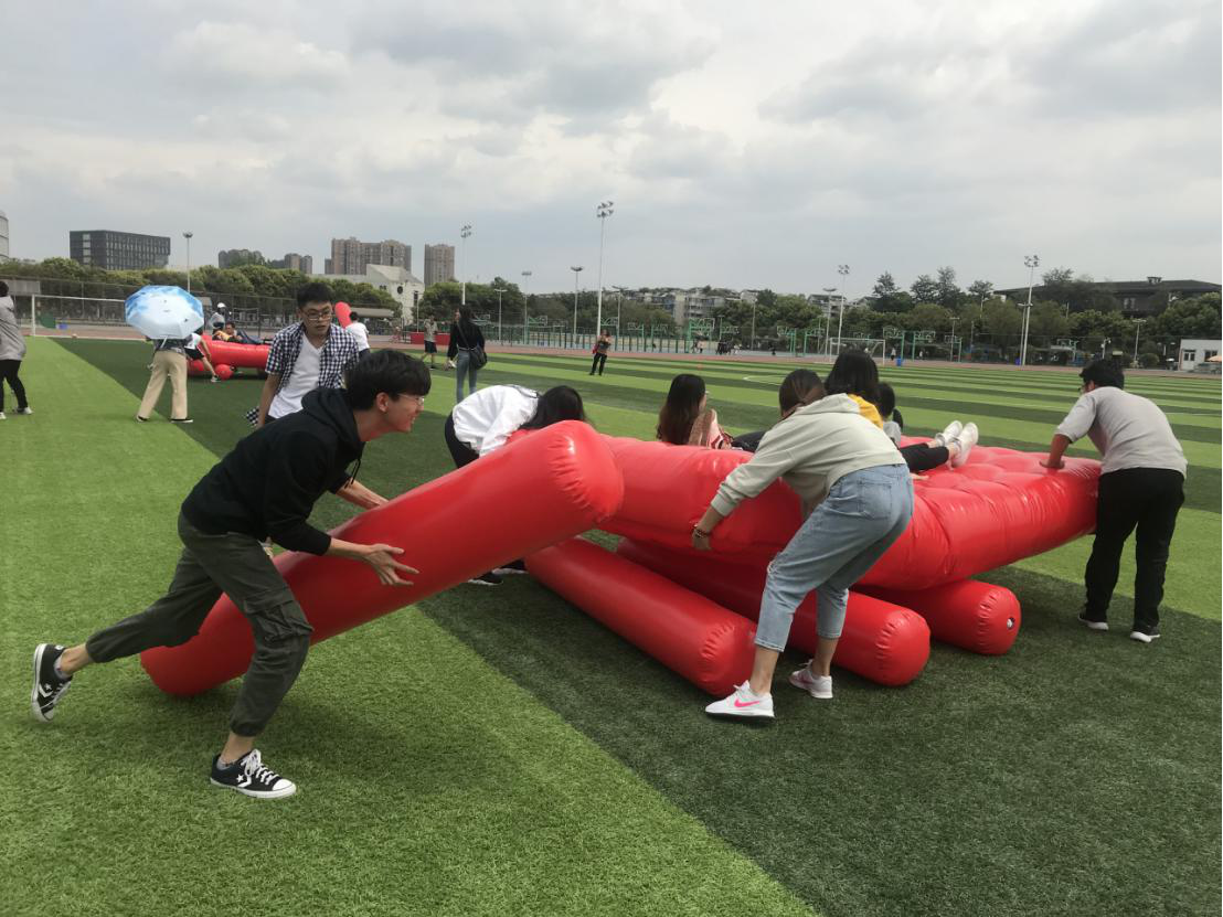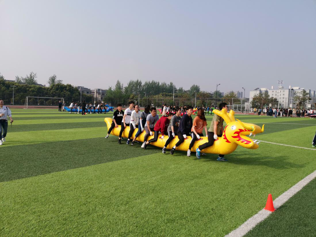 趣味运动会旨在贯彻全国体育教指委“全员参赛要求”的指示,激发学生运动兴趣,调动学生参与进来,融入进去,从而培养学生强身健体、勇于拼搏、团结协作的精神,丰富大学生课余生活。本次比赛共设巨人脚步、划龙舟、无敌风火轮、投沙包、趣味定向、足球飞镖等十四个项目。