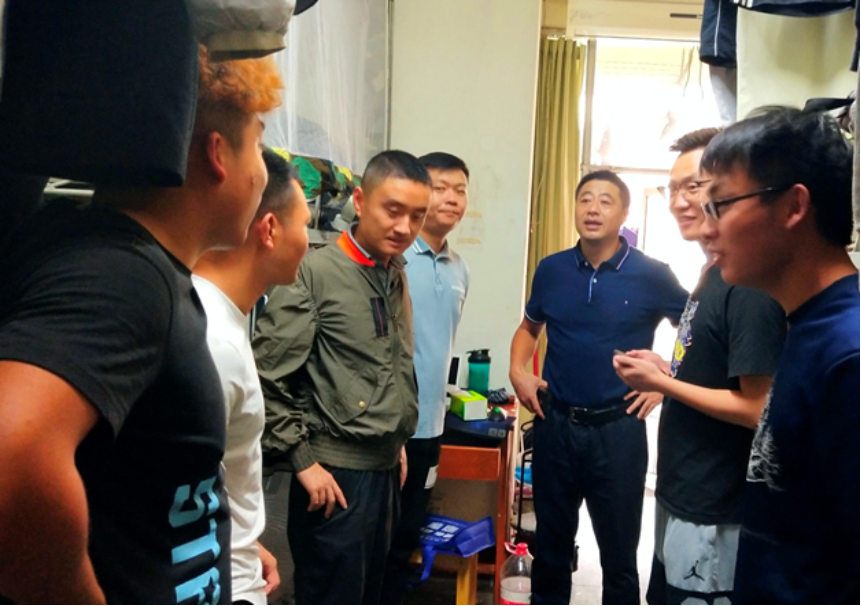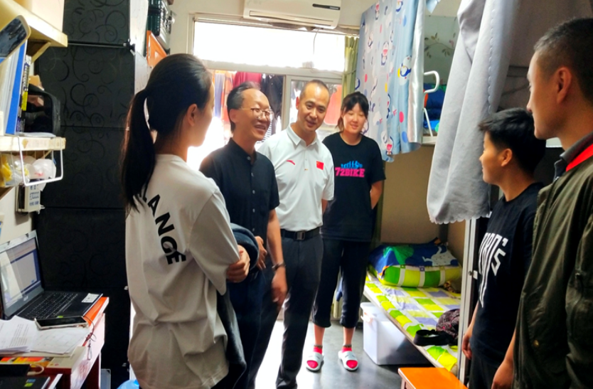 为了解新生动态,关切新生需要,营造团结、和睦的宿舍氛围。2019年9月6号上午,体育学院党总支书记夏泽友同志、院长向勇教授、正处级组织员荣文学教授、学生科科长周敏老师、学生辅导员贠琰老师等一行来到新生寝室,与我院体育英国365官方网站所2019级新生进行面对面交流。每到一个宿舍,学院领导都与学生们亲切交谈,细心询问新生们是否适应新的宿舍生活,且仔细检查宿舍安全卫生情况,并叮嘱同学们注意用电、防火、食品等方面的安全问题。
