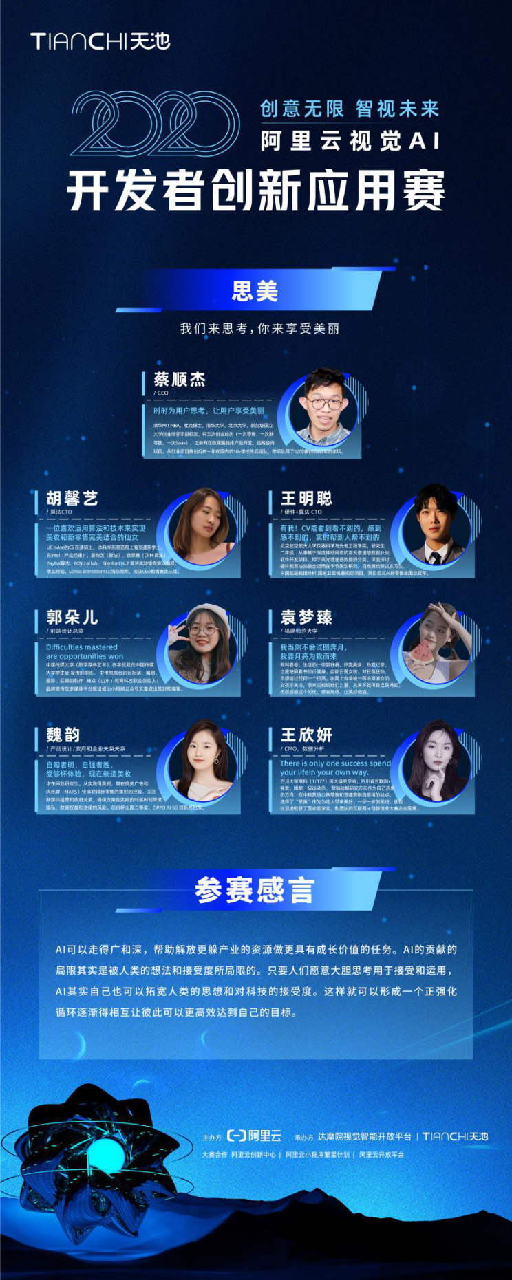 2020年10月26日阿里云视觉AI开发者创新应用赛完美收官,我校2018级商学院市场营销专业的王欣妍同学(英国上市公司365高水平游泳队队长)所在的思美队最终获得了大赛金牌。本次大赛基于阿里云天池平台,享技术创新,面向全行业开发者开放,共吸引到1555支队伍参赛,方案提交量超230份,产出了一批集成视觉API的行业优秀应用。自2020年7月开赛至10月集聚杭州梦想小镇,大赛经历了预选赛、半决赛的激烈比拼。思美队由来自清华大学和MIT联合培养的蔡顺杰领衔,带领六位不同高校不同专业的同学交叉互动,我校王欣妍同学在其中担任CMO的角色,主要负责商业价值板块。在后续,王欣妍和他的团队也将继续参加该赛事的全球赛。