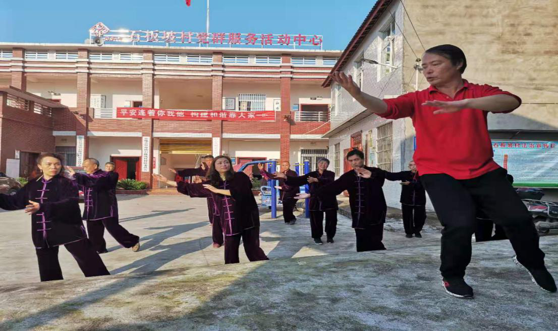 在前期走访调研中得知,“因病致贫”是导致贫困的重要因素,不仅治疗费是巨大负担,疾病还使得他们失去劳动力,也夺取了他们的幸福感,为此,体育学院提出“体育健身养生扶贫”方案,希望通过参与体育活动让村民们掌握一些基本的健身养生知识和方法,以期丰富当地村民的文化生活,养成良好的生活习惯,强势健体,远离疾病。体育学院此次扶贫为石板坡村文化活动室捐助了一批体育器材和太极拳练习服装,为村民健身提供物资保障,同时,派出了学院武术专家廖沛然教授,为村民骨干进行太极拳的培训。廖沛然老师耐心教学认真辅导,通俗易懂的养生健身知识介绍以及标准的技术示范吸引着参训人员,尽管天气炎热,参与培训的骨干仍然热情高涨,培训活动结束后大家纷纷表示收获满满。