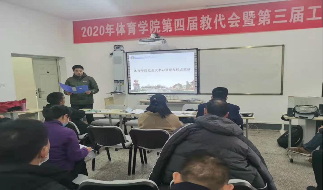 党总支书记夏泽友同志在开幕式致辞中代表学院党总支对大会的召开表示热烈祝贺!并提出了会议要求和学院发展希望,他谈到,在常态化疫情防控背景下,2020年体育学院上上下下保持大无畏战斗精神,围绕学校“两大考场”顺利完成了各项年度工作任务,保障了学院师生健康和平安。工作成绩的取得,与全体教职工的付出、与学院工会和教代会的工作密不可分,希望全体与会代表以饱满的热情,共同完成大会预定的各项议程,把本次会议开成一个发扬民主、献计献策、凝聚力量、求真务实、开拓进取、团结奋进的大会。