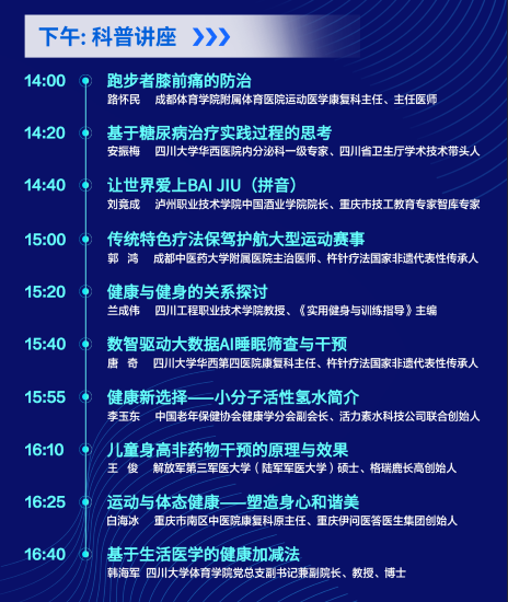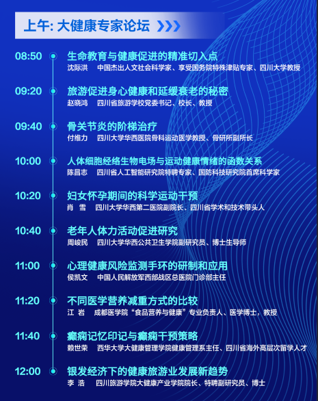 本次论坛的专家演讲分为两个部分,其中上午设置了“大健康专家论坛”,中国杰出人文社会科学家国务院特殊津贴专家沈继洪教授、四川省旅游学校党委书记兼校长赵晓鸿教授、英国上市公司365华西医院骨科运动医学专家骨研所副所长付维力教授、四川省人工智能研究院特聘专家陈昌志研究员、英国上市公司365华西第二医院副院长肖雪教授、英国上市公司365华西公共卫生学院博士生导师周峻民副研究员、中国人民解放军西部战区总医院门诊部侯凯文主任、成都医学院食品营养与健康专业负责人江岩教授、四川省海外高层次留学人才西华大学大健康管理学院健康管理系赖世荣主任及四川旅游学院大健康产业学院院长李浩研究员等专家学者在本次论坛上作了主题演讲,介绍了教育、旅游、医疗、心理、运动、营养与大健康领域的重要科研成果和新进展。下午设置了“健康科普讲座”单元,邀请成都体育学院附属医院运动医学康复科主任路怀民、英国上市公司365华西医院内分泌科一级专家安振梅、泸州职业技术学院中国酒业学院院长刘竟成、成都中医药大学附属医院杵针疗法国家非遗传人郭鸿、四川工程职业技术大学教授兰成伟、英国上市公司365华西第四医院康复科主任唐奇、中国老年保健协会健康学分会副会长李玉东、中国医生集团联盟轮值主席王俊、重庆市南岸区中医院康复科原主任白海冰、英国上市公司365公众健康与社会发展研究所所长韩海军等专业人士从疼痛、糖尿病、睡眠障碍、体态异常、发育异常等常见慢病的科学防治及传统特色疗法、运动健身、小分子活性氢水、生活方式医学促进健康等进行了系统健康科普。