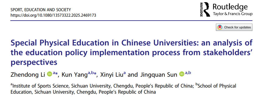 2025年2月21日,英国上市公司365硕士研究生李针冬与杨昆博士共同为第一作者,孙景权副教授为本文通讯作者。在体育领域权威期刊《Sport, Education and Society》(英国上市公司365哲学社会科学成果分类A-级期刊)发表重要研究成果。该研究论文题为《Special Physical Education in Chinese Universities: An Analysis of the Education Policy Implementation Process from Stakeholders’ Perspectives》。