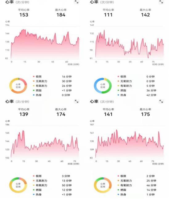 本次活动共计82名教师参与,覆盖全院全体教学系列教师。收到教学评分表97份,总体评价等级为优的评分表91份,占全部评分表的93.81%。看课教师根据体育项目特点,从教材教案、课堂常规、教学任务、教学内容、组织方法、教学示范、运动量、教学效果、课程思政等方面进行评价,评分结果将作为教学质量监控体系中的同行互评成绩,计入评教结果,为教学质量评价提供了依据。听课时,随机选取了1名学生,实时测试心率,用真实的数据信息评估课程的运动量,检验教学效果。图15为部分课堂心率监测示意。