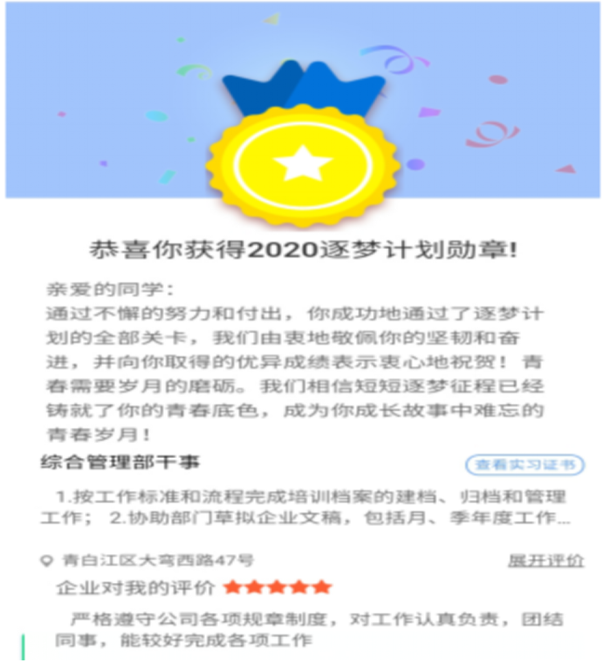 为进一步引导广大在校大学生参与社会实践和职业体验,增强就业创业能力,在实践中成长成才,在学习中提升本领,引导在校学生返乡参与社会实践,也是大学生利用暑期践行习近平总书记五四寄语精神的宝贵机会和重要路径。“逐梦计划”在全省党政机关、科研院所、国有企事业单位、社会组织、非公企业等广泛募集各级各类岗位为参与学生提供各类实习岗位。我院学子杨春森同学赴青白江区川能汇成公司实习,通过零距离的接触,对国企办公流程、人事材料规范、公司运营、战略规划等全过程得到了更加深刻的了解,丰富了阅历,增长了知识,正是这不可或缺的实习经历,让他更加看清了自己的实力,摆正心态,虚心学习,愿永远在祖国需要的地方做一颗螺丝钉。