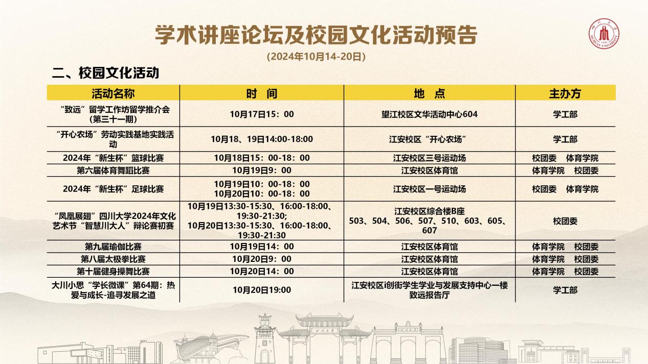 学术讲座及校园文化活动预告(10月14-10月20)