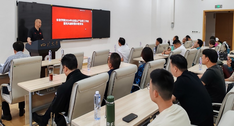 4月16日,体育学院在望江体育中心会议室召开2024年全面从严治党工作会暨党风廉政警示教育会议,学院班子成员、组织员、总支委员、党支部书记,全体中层干部、全体教练员参会。会议由院长向勇主持。