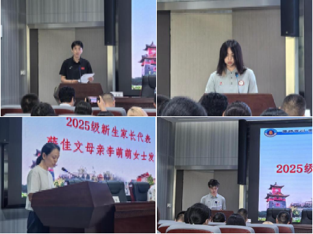 2025级新生家长代表薛佳文母亲发言,叮嘱同学们珍惜美好的大学时光,在求学的同时注意身体健康。