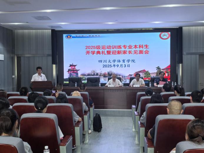 2025年9月3日,我院在江安校区未来游泳馆会议室举行了2025级运动训练专业本科生开学典礼暨迎新家长见面会。学院领导班子、相关职能部门负责人、本科辅导员、2025级新生以及全体新生家长参加会议。会议由体育学院副院长韩海军主持。