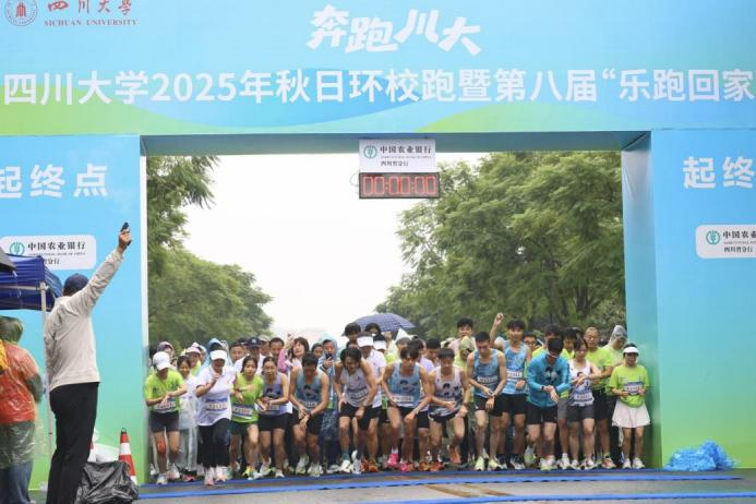 教职工、学生及校友代表齐聚田径场,积极参与了竞技跑活动。本次竞技跑路线沿环形大道西段展开,途经白石桥、图书馆、东大门、青春广场等校园标志性地点,最终返回运动场。活动期间虽遇绵绵细雨,但未减参与者的奔跑热情,大家穿梭于美丽校园,以坚定的步伐与饱满的状态,展现出川大人昂扬的精神风貌。
