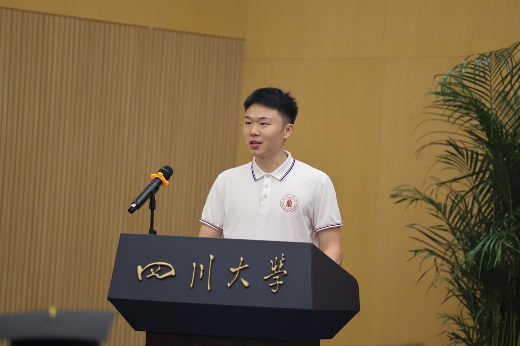 在校生代表甘文轩同学代表全体在校生向2024届的师兄师姐们表达最衷心的祝贺,祝贺师兄师姐们在祖国大地上抒写了属于“川大人”的绚烂华章,为自己的川大求学岁月画上圆满句号,他希望师兄师姐们能带着川大人深深的烙印去开拓探索,“赓续传承“川大红”,争做“有德”“有志”“有为”青年,把“海纳百川,有容乃大”的校训精神融入拼搏向上的动力中,为推进中国式现代化贡献青春智慧和力量!